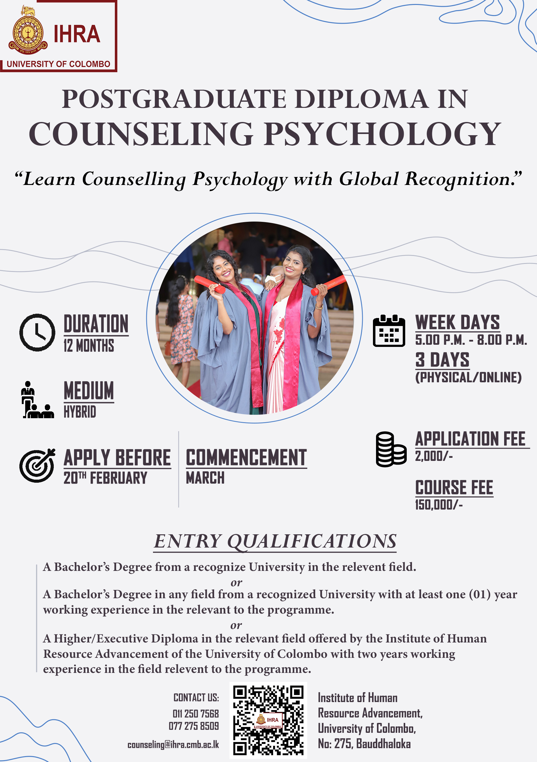At the Counselling Unit of IHRA, University of Colombo, we offer a diverse range of programs aimed at nurturing aspiring professionals in the field of counseling psychology. Our curriculum combines theoretical insights with practical applications, ensuring that students gain a comprehensive understanding of the discipline. Guided by experienced faculty and industry experts, our programs emphasize critical thinking, empathy, and practical skills necessary for effective counseling practice. Whether you're looking to pursue a diploma or a postgraduate degree, our offerings provide a solid foundation for a fulfilling career in supporting individuals facing various psychological challenges. Join us to embark on a journey of personal and professional growth, making a positive impact in the lives of others.