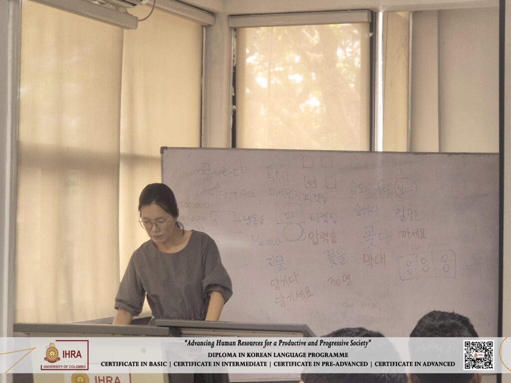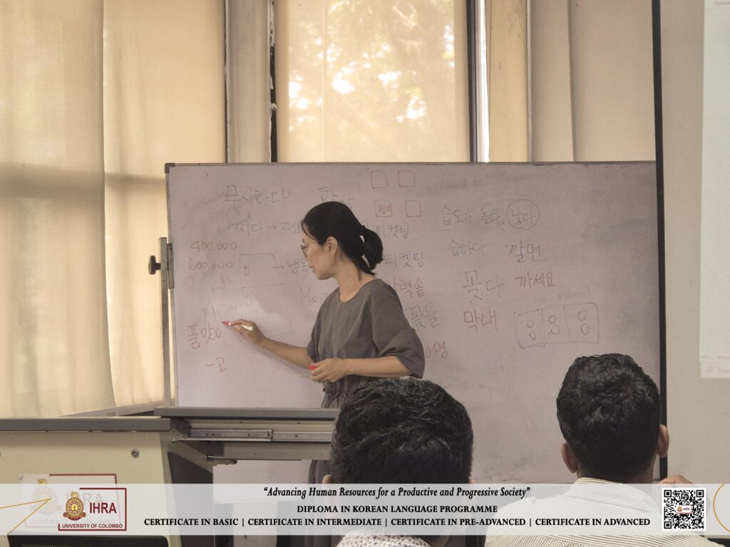 The Institute of Human Resource Advancement (IHRA), University of Colombo is pleased to offer the Diploma in Korean Language, providing students with an exceptional opportunity to learn Korean under the guidance of a Korean lecturer. This programme combines structured language instruction with cultural insights, ensuring an authentic and high-quality learning experience.