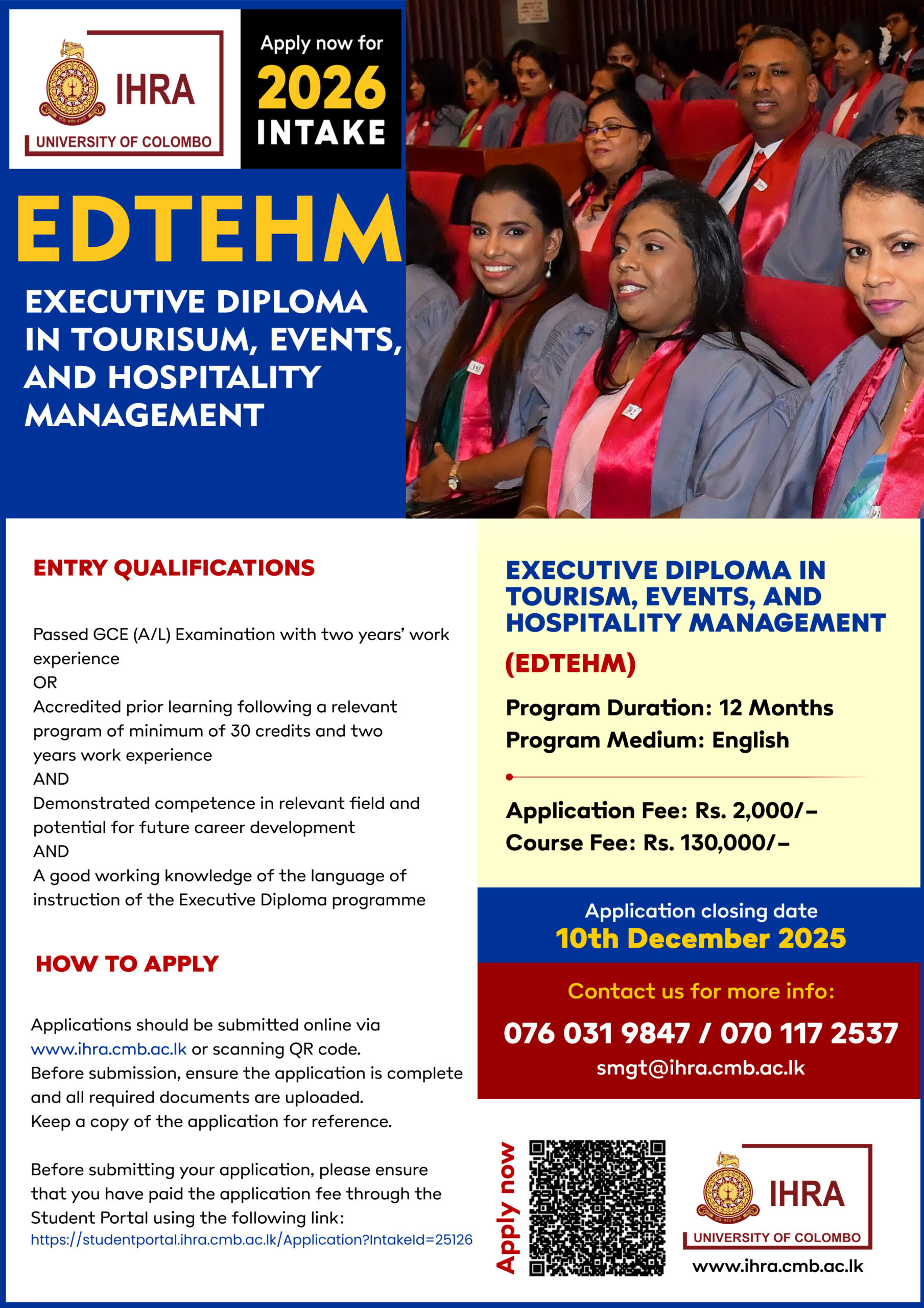 Application Calling for Executive Diploma in Tourism, Events and Hospitality Management (EDTEHM) – Intake 2025by Web AdminNovember 20, 2025November 20, 2025 Online Payment Apply Online