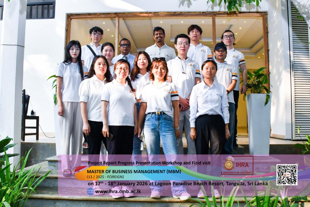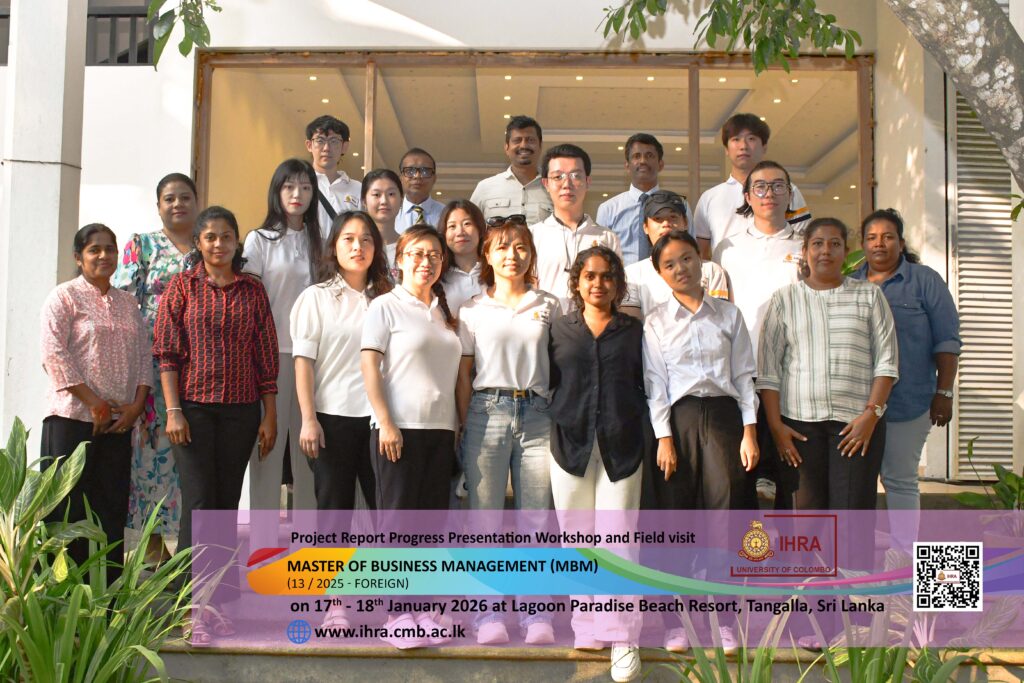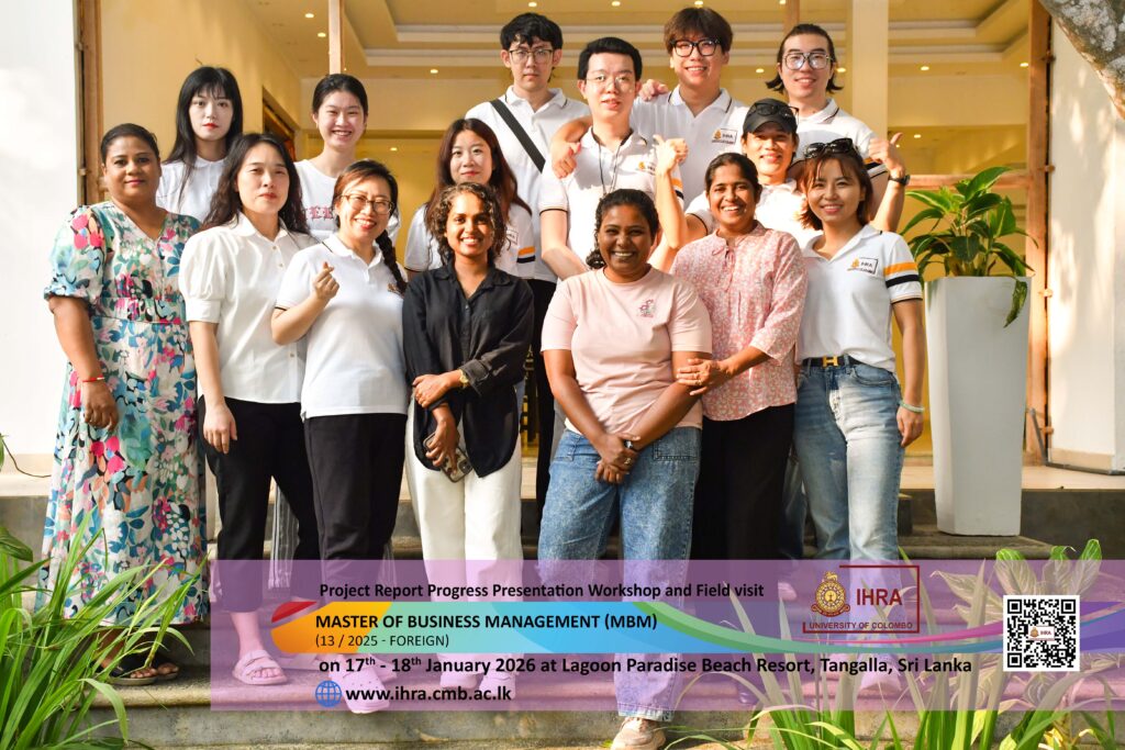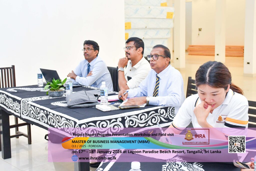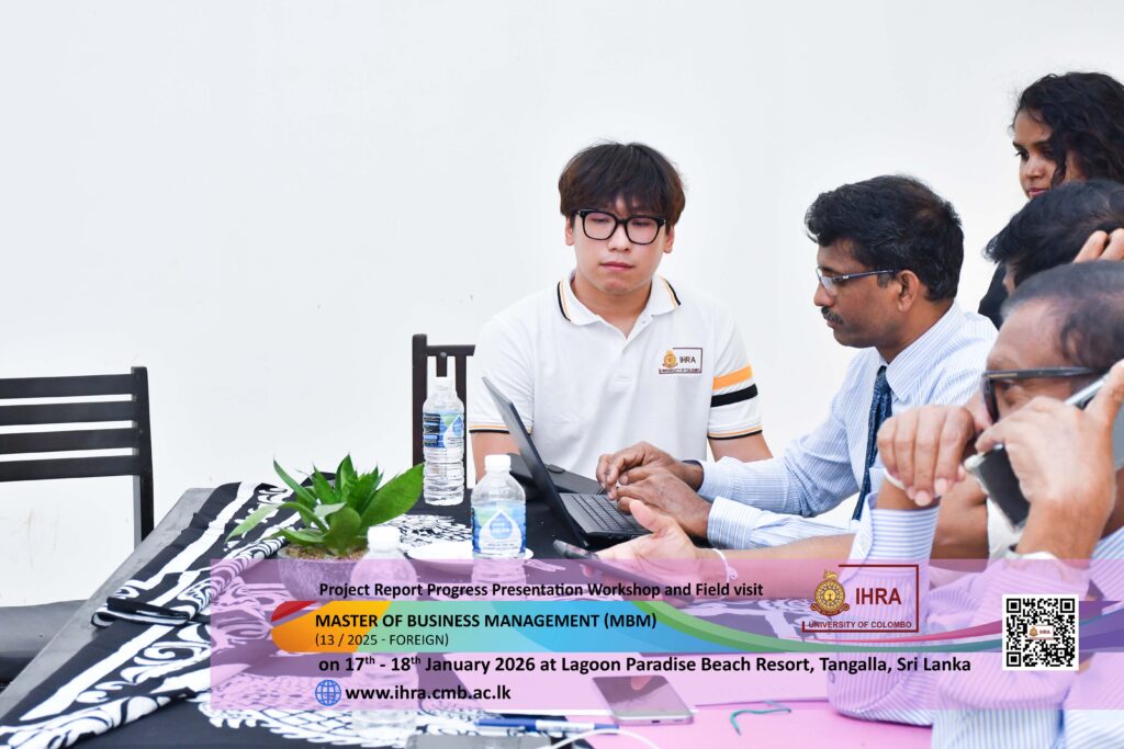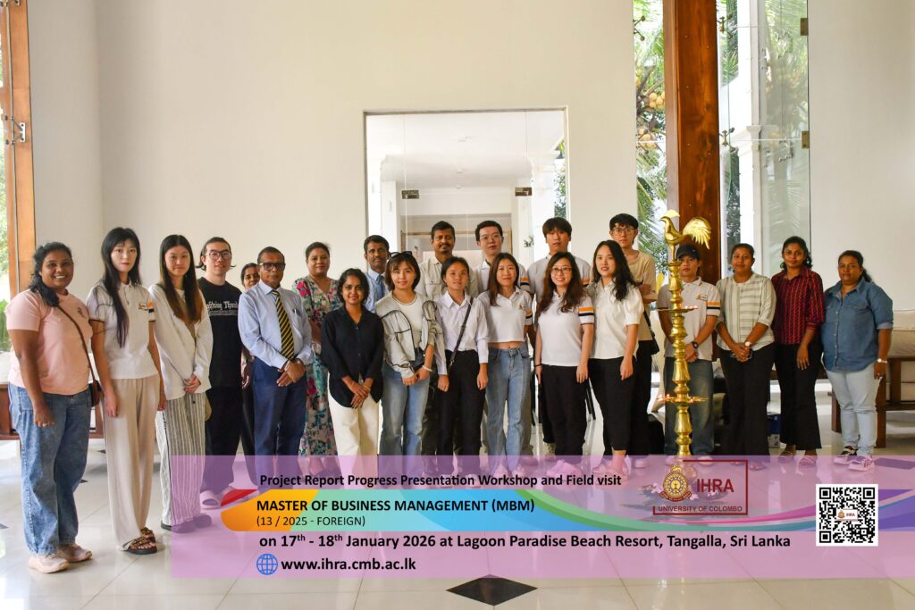 The Institute of Human Resource Advancement (IHRA), University of Colombo successfully conducted the Project Report Progress Presentation Workshop and Field Visit for the Master of Business Management (MBM) Batch 13 (2024/2025 β Foreign Students) on 17th and 18th January 2026 at the Lagoon Paradise Beach Resort, Tangalle.