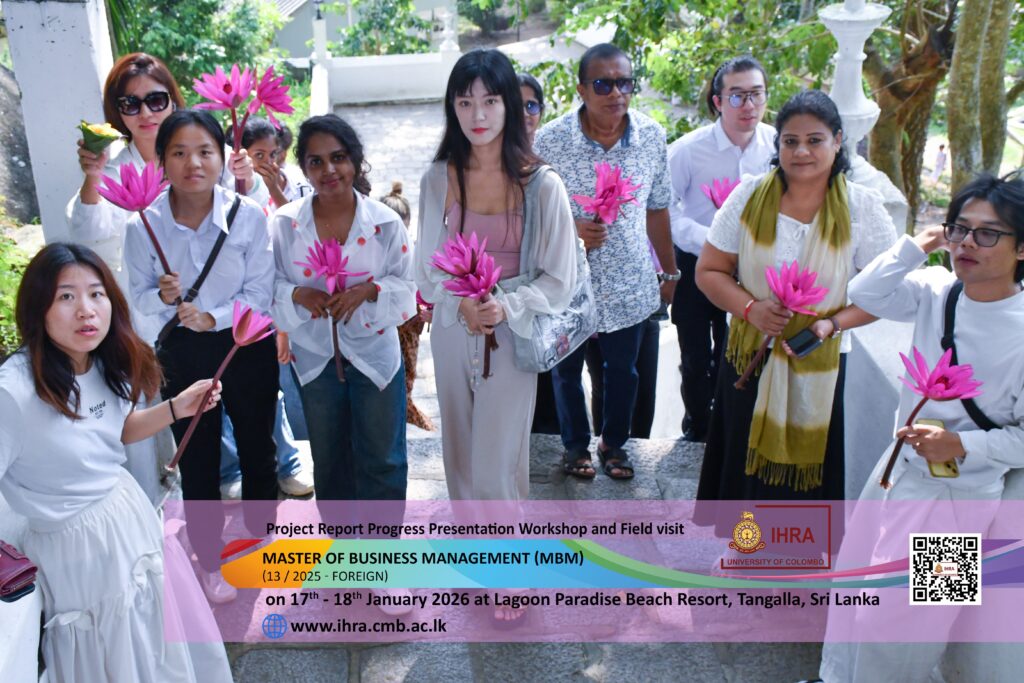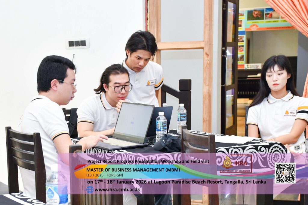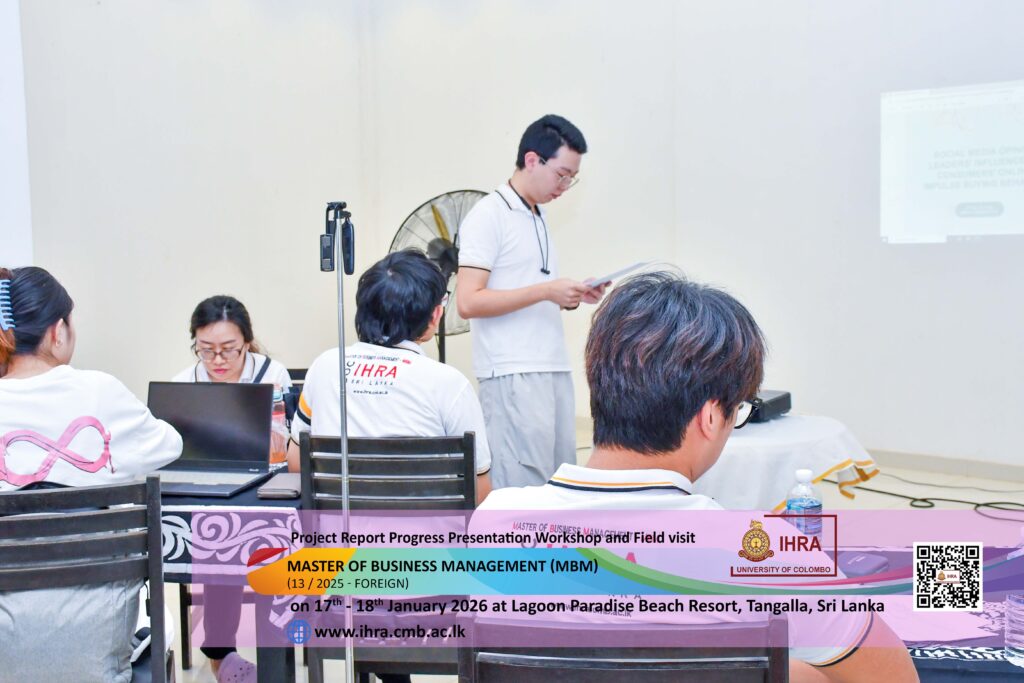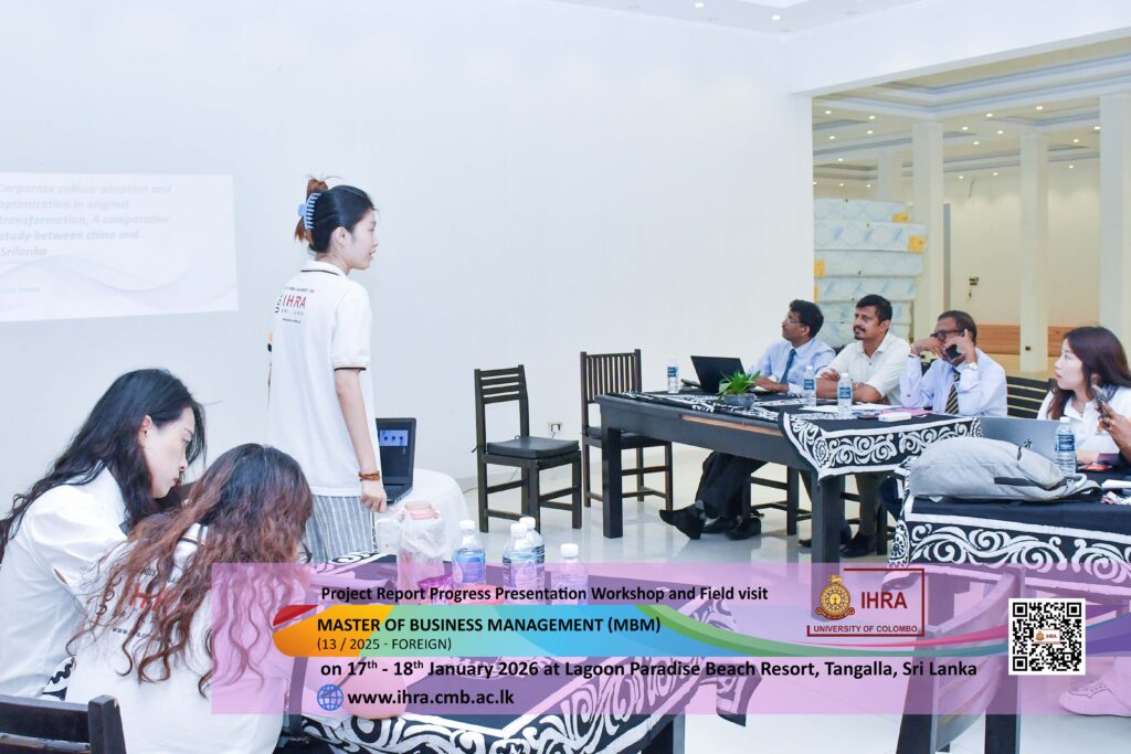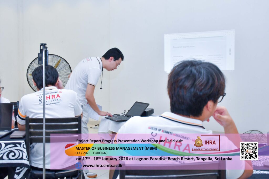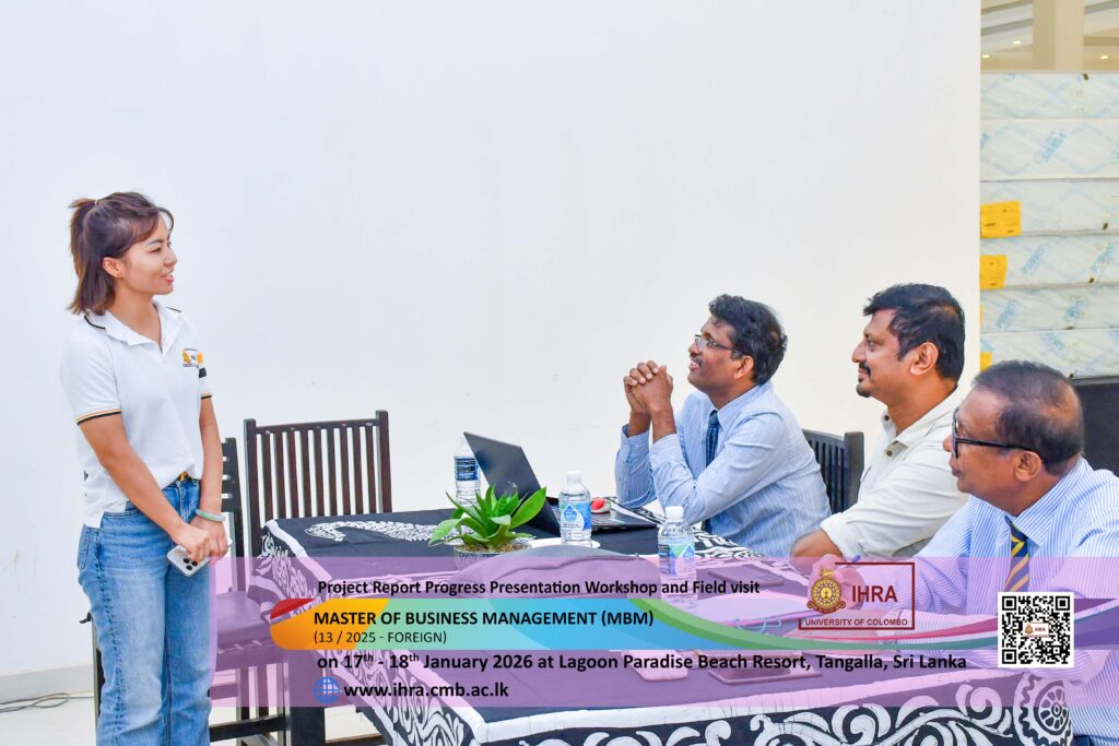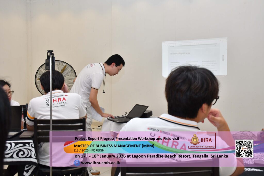 The Institute of Human Resource Advancement (IHRA), University of Colombo successfully conducted the Project Report Progress Presentation Workshop and Field Visit for the Master of Business Management (MBM) Batch 13 (2024/2025 β Foreign Students) on 17th and 18th January 2026 at the Lagoon Paradise Beach Resort, Tangalle.