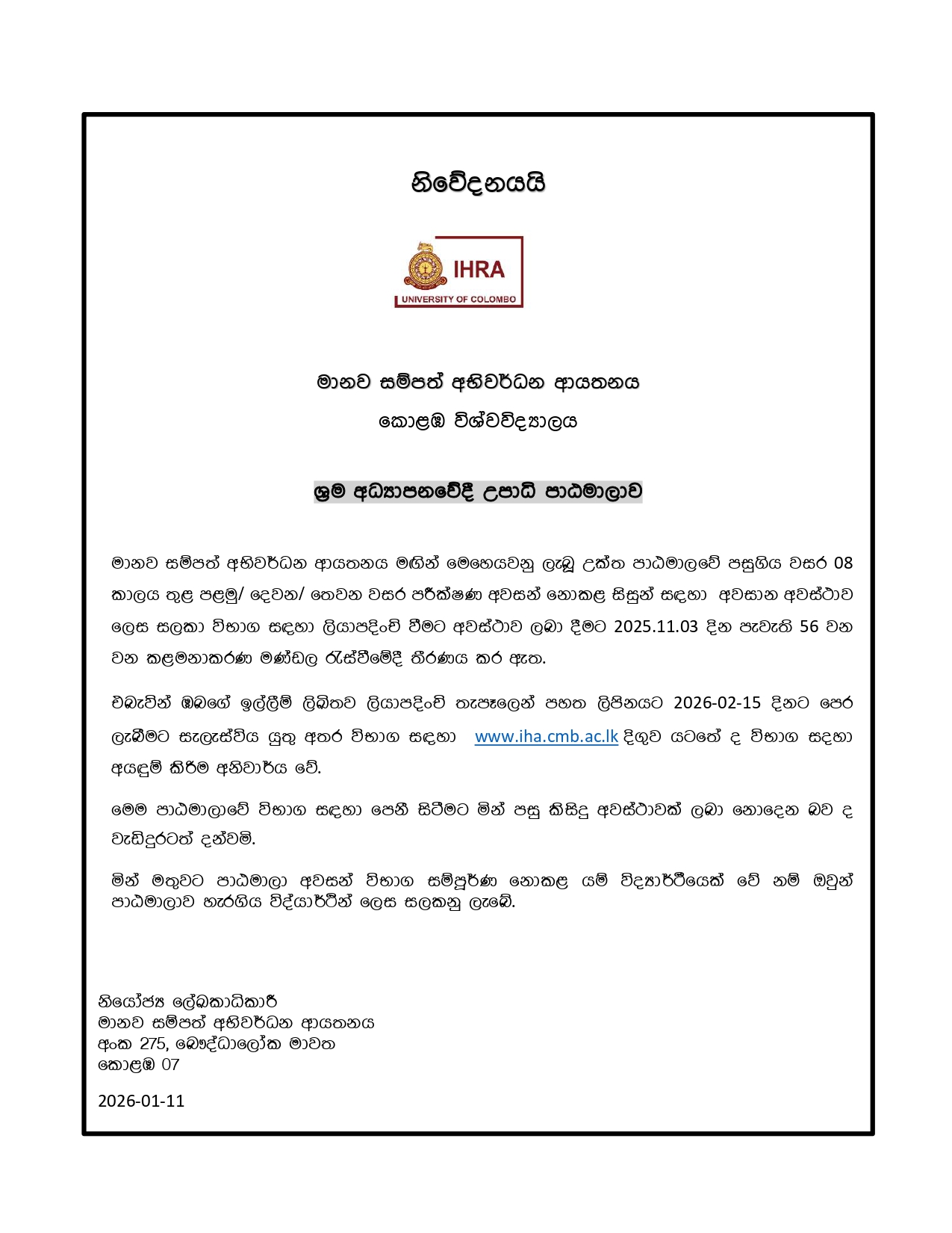 Notice to Bachelor of Labour Education (BLE) Final Repeat Examination Applicantsby Ashani PereraJanuary 16, 2026January 16, 2026 Apply Online
