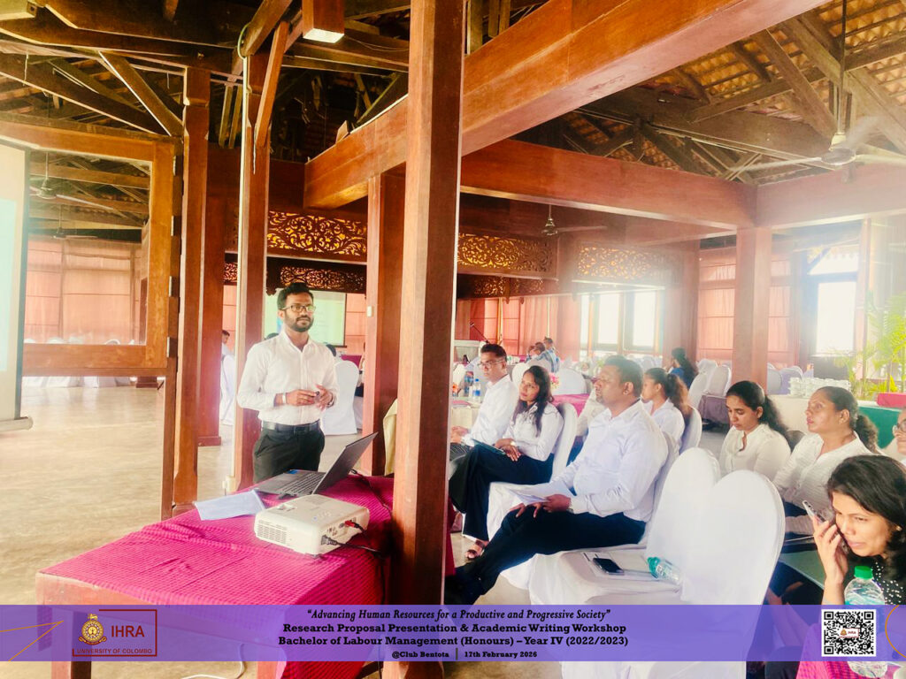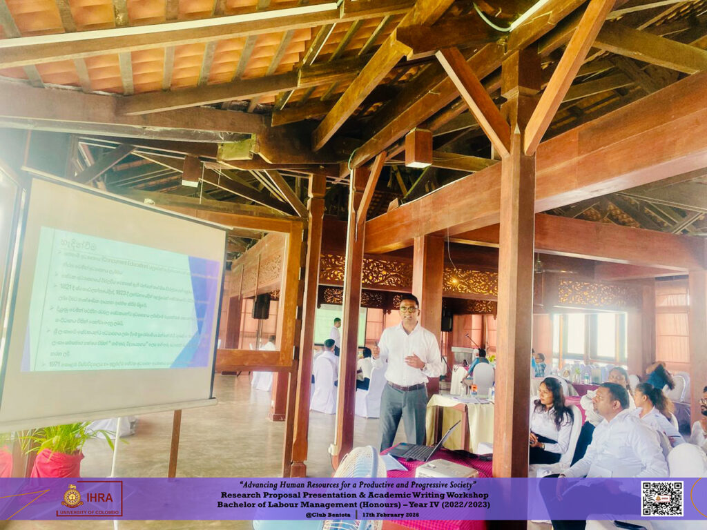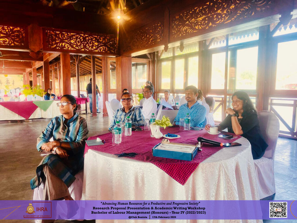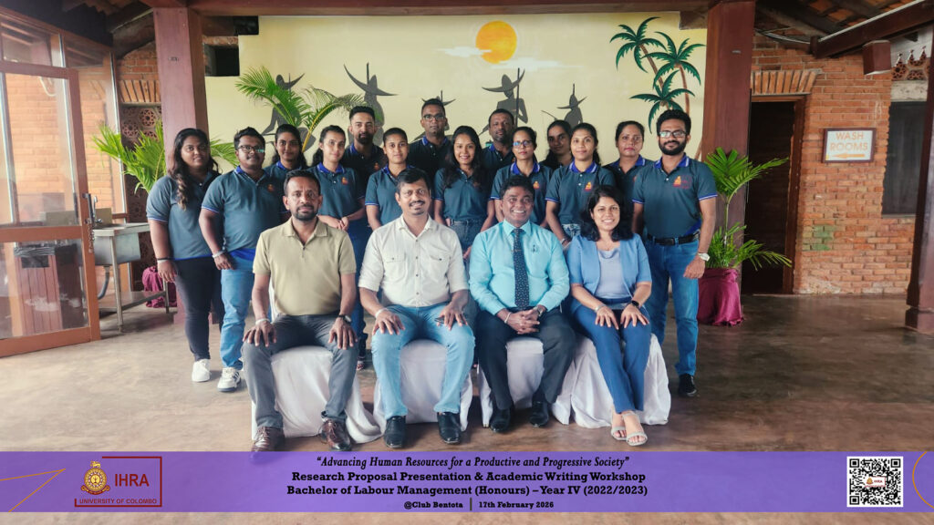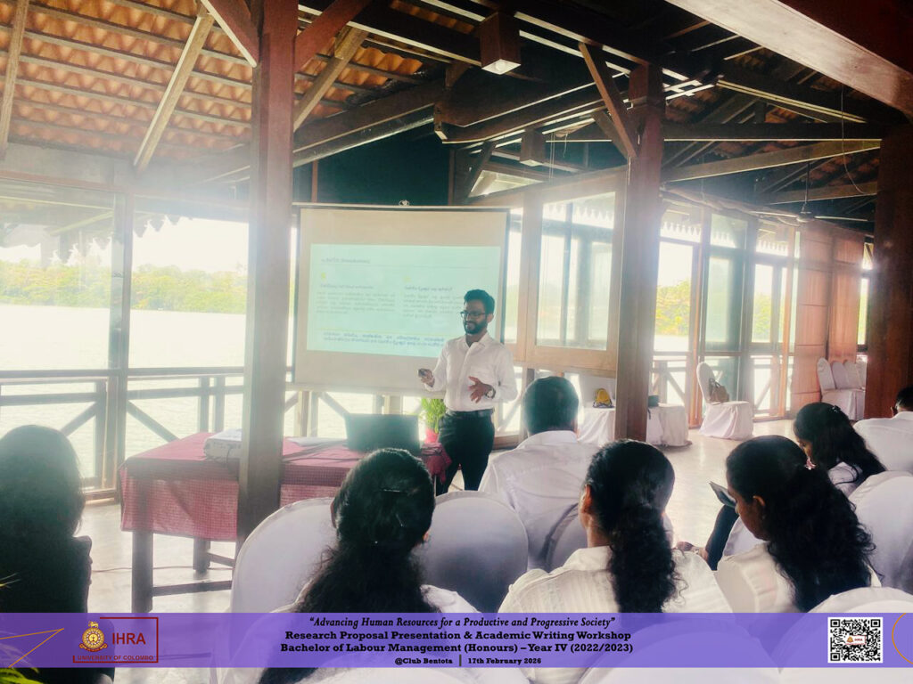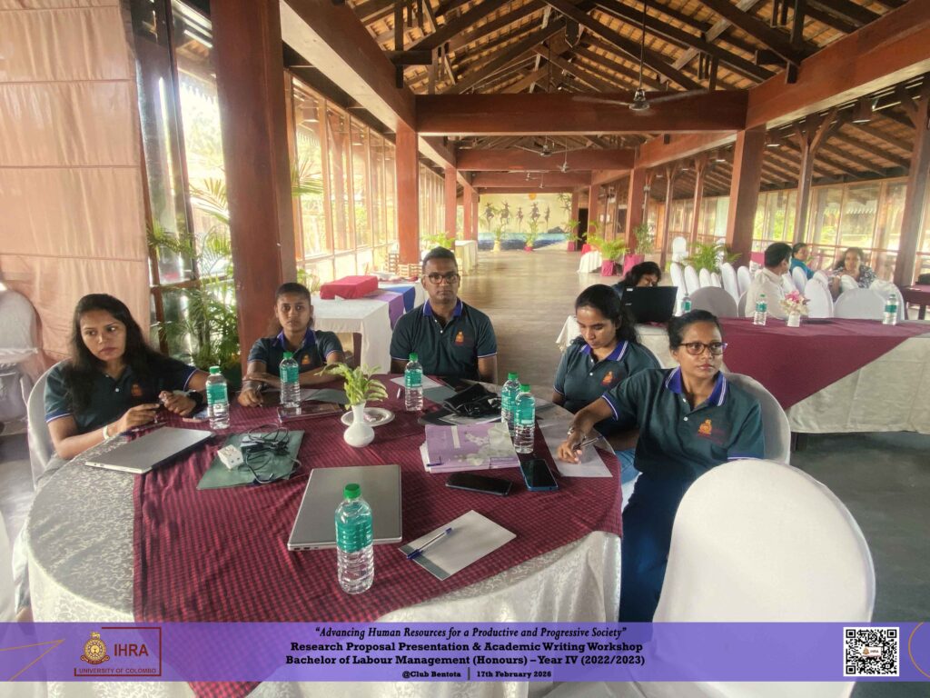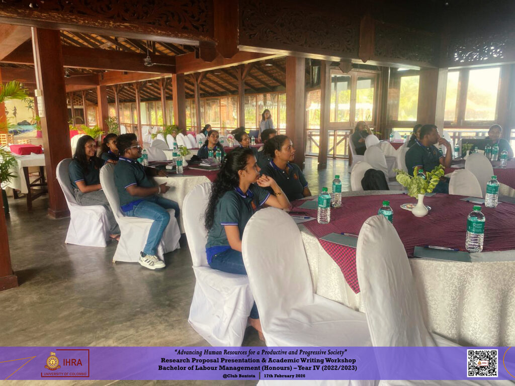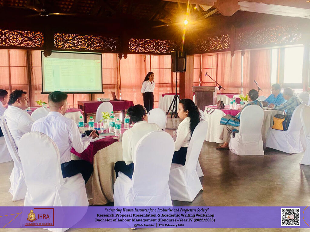 The Institute of Human Resource Advancement (IHRA), University of Colombo, successfully conducted the Research Proposal Presentation and Academic Writing Workshop for the students of Bachelor of Labour Management (Honours) Degree – Year IV (2022/2023) on 17th February 2026 at Club Bentota, Paradise Island, Aluthgama, Sri Lanka.