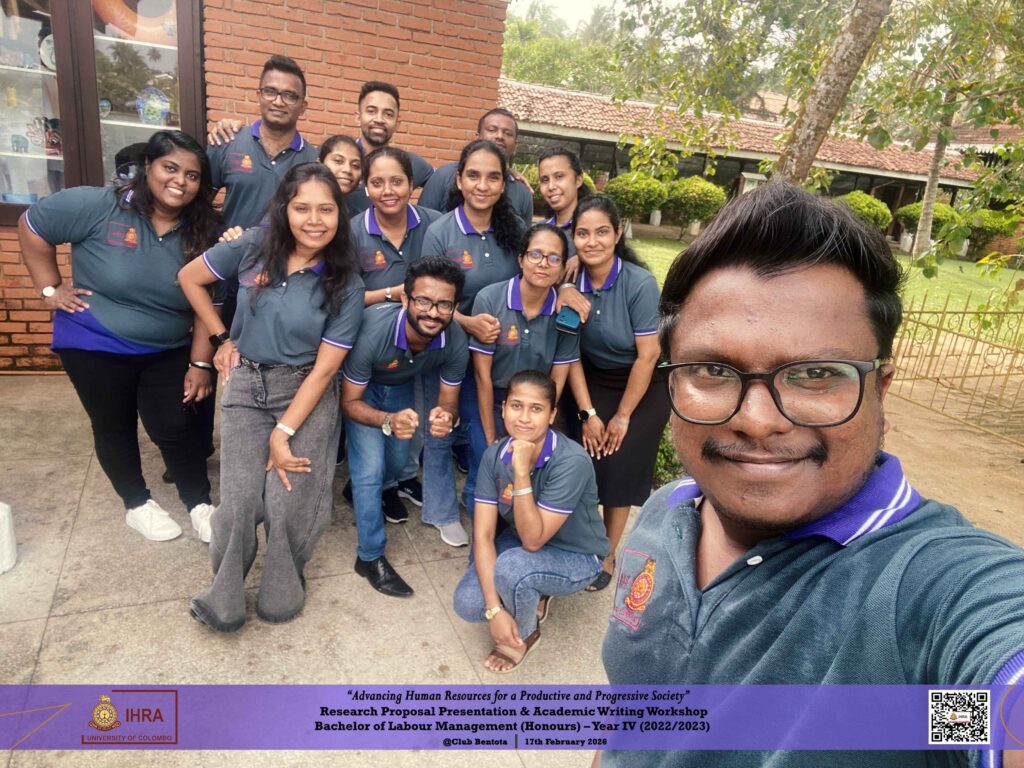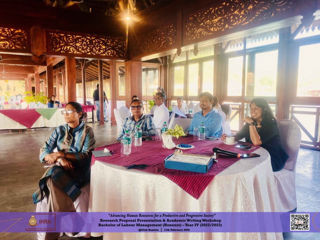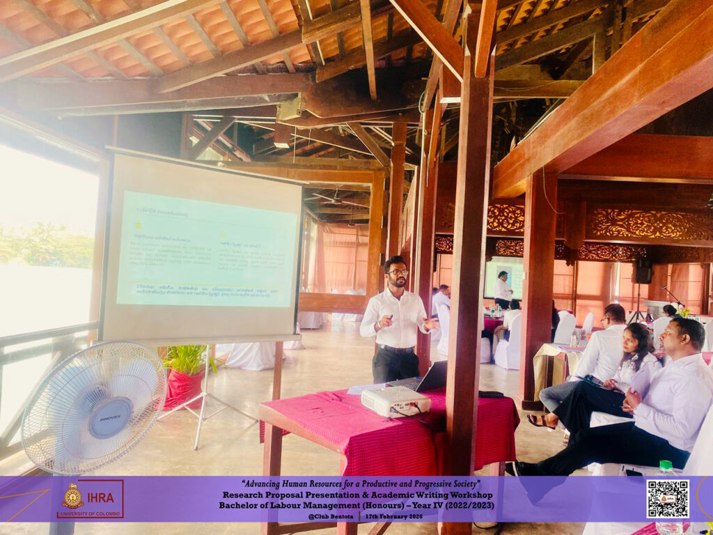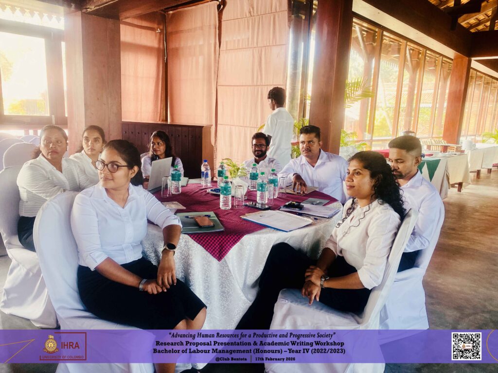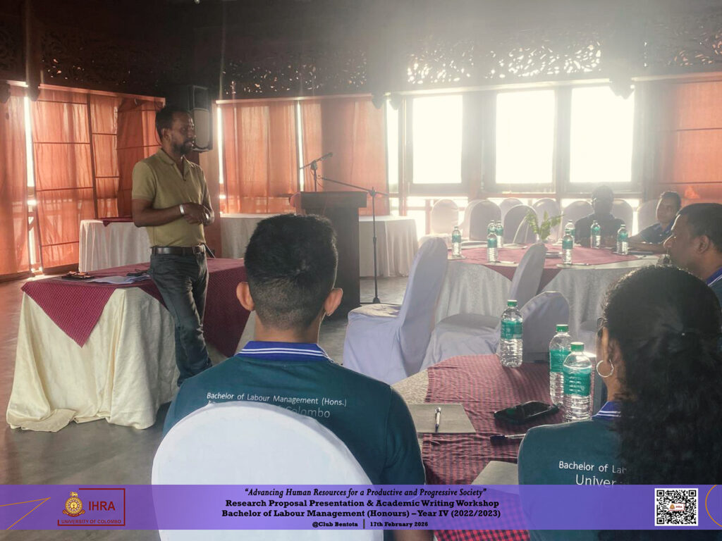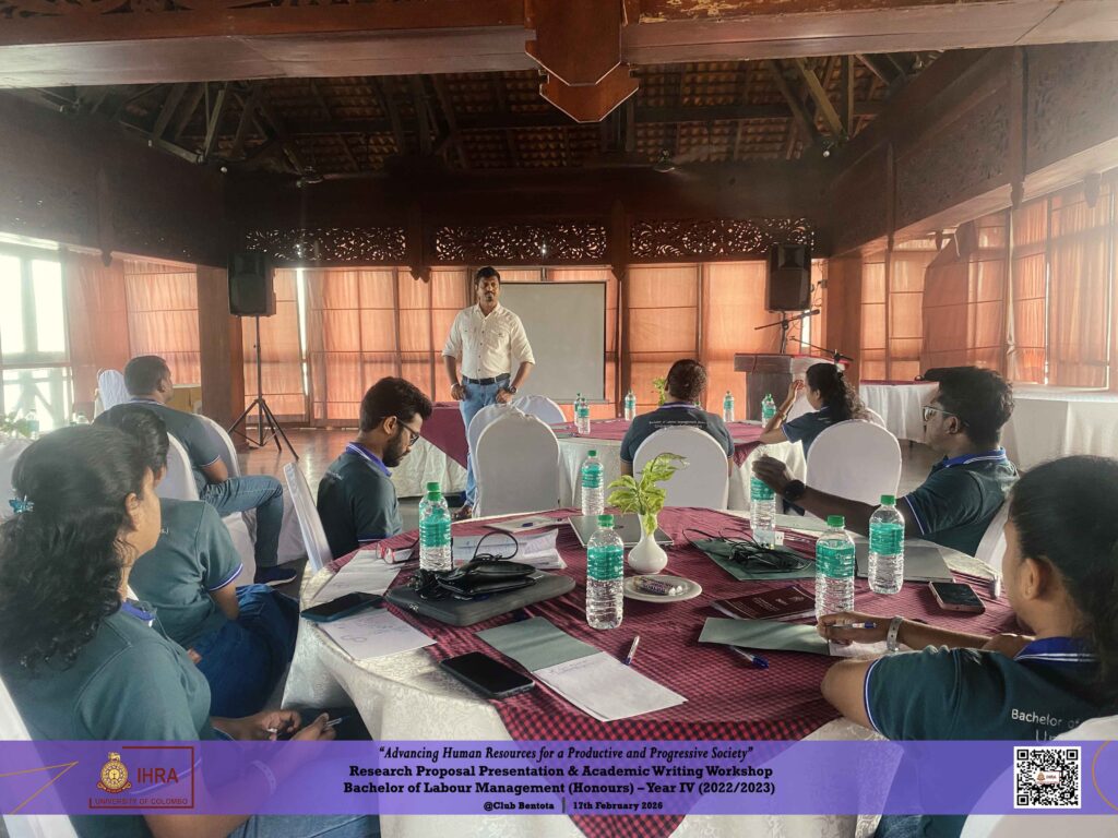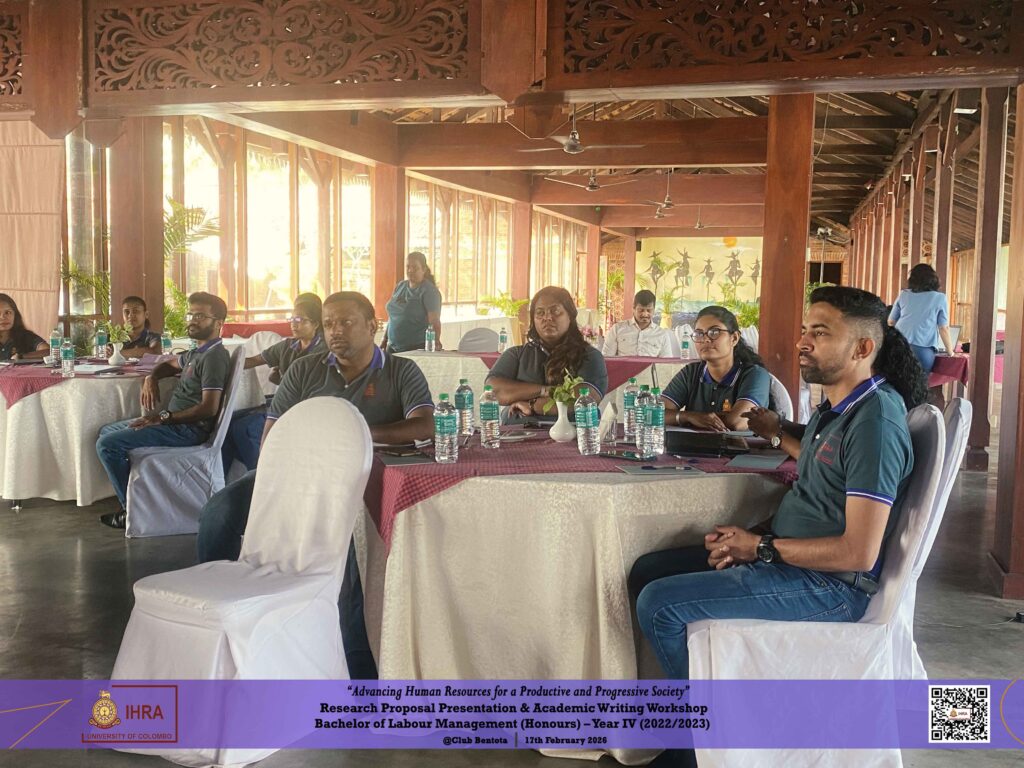 The Institute of Human Resource Advancement (IHRA), University of Colombo, successfully conducted the Research Proposal Presentation and Academic Writing Workshop for the students of Bachelor of Labour Management (Honours) Degree – Year IV (2022/2023) on 17th February 2026 at Club Bentota, Paradise Island, Aluthgama, Sri Lanka.