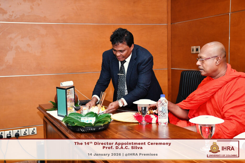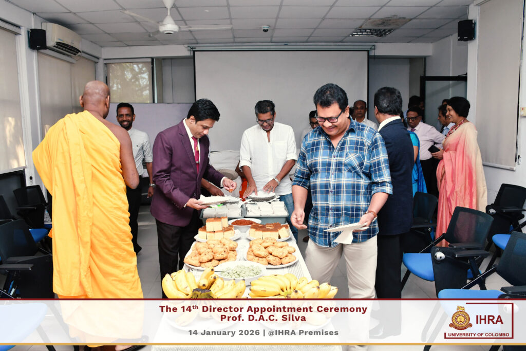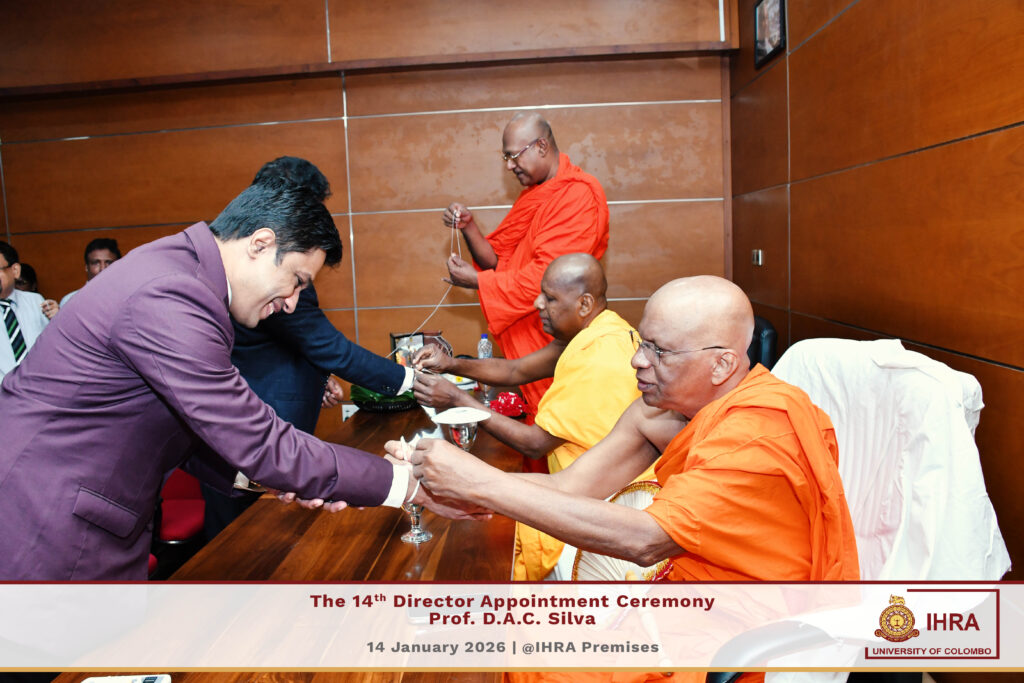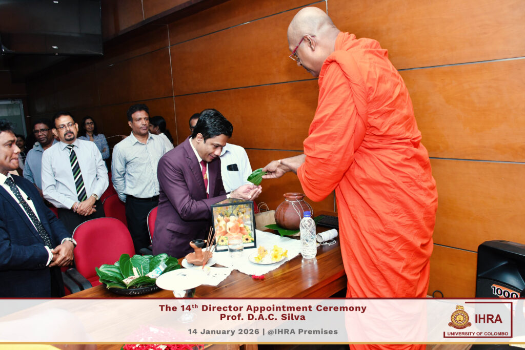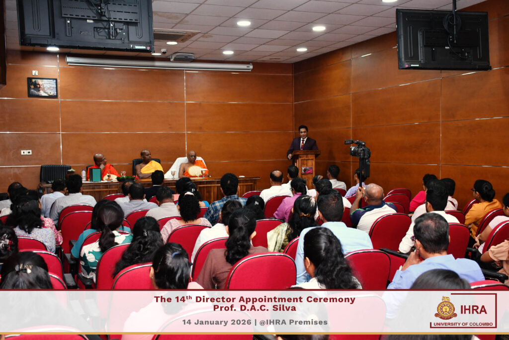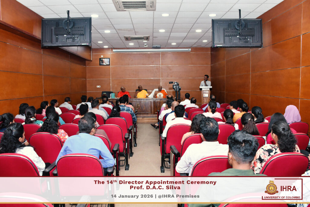 The 14th Director Appointment Ceremony of the Institute of Human Resource Advancement (IHRA), University of Colombo was held at the IHRA premises on 14 January 2026, with the participation of distinguished guests. The ceremony was graced by Kirinde Assaji Thero, Viharadhipathi of the Gangaramaya Temple; Ven. Prof. Agalakada Siri Sumanasara Thero, Professor in Sinhala, Department of Sinhala, Faculty of Arts, University of Colombo; and Rev. Prof. Emeritus W. Wimalaratana, Faculty of Arts, University of Colombo.