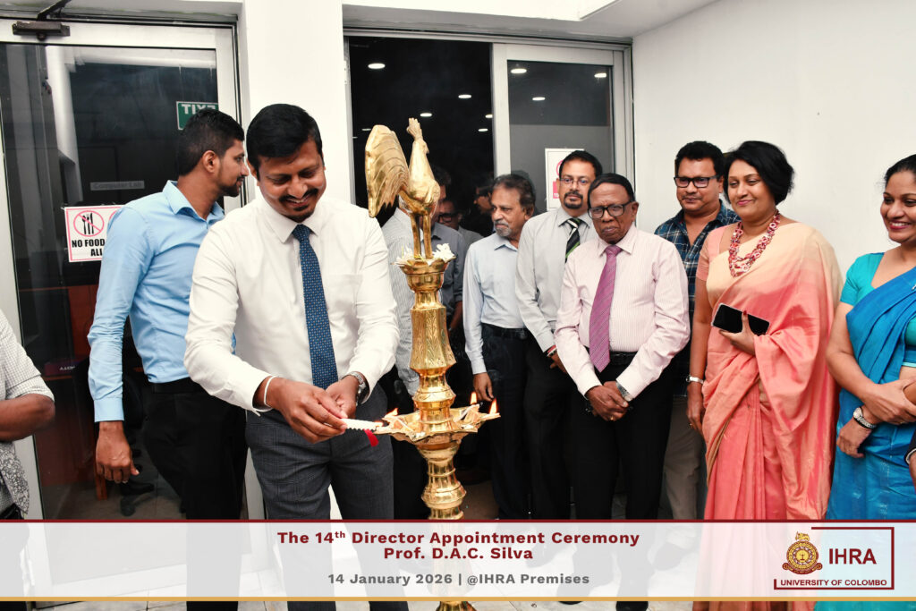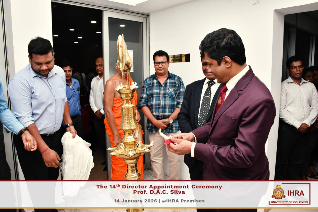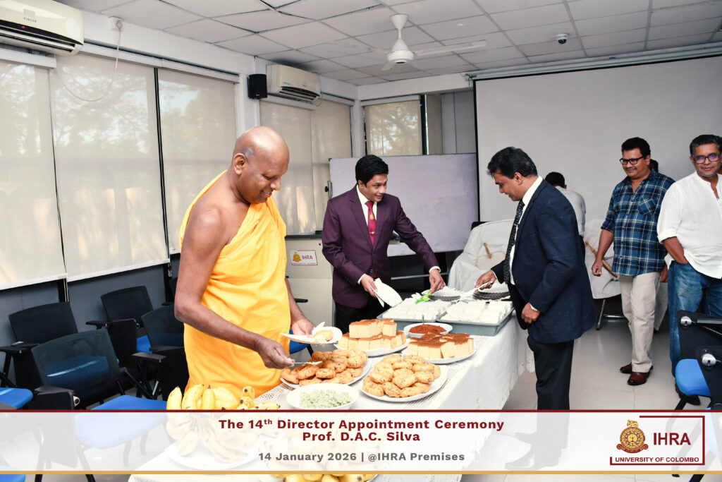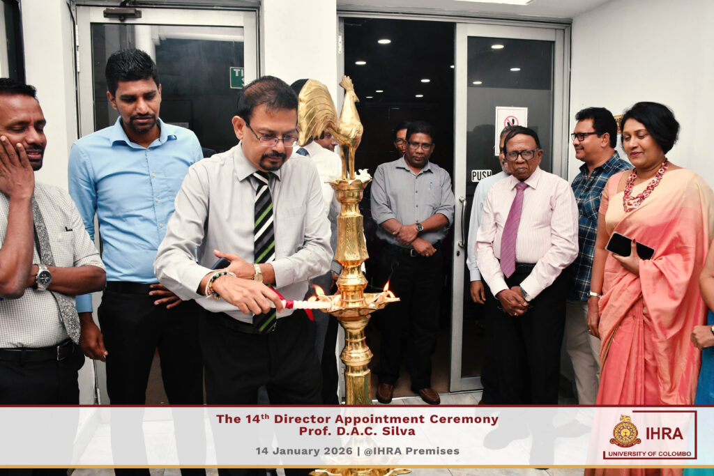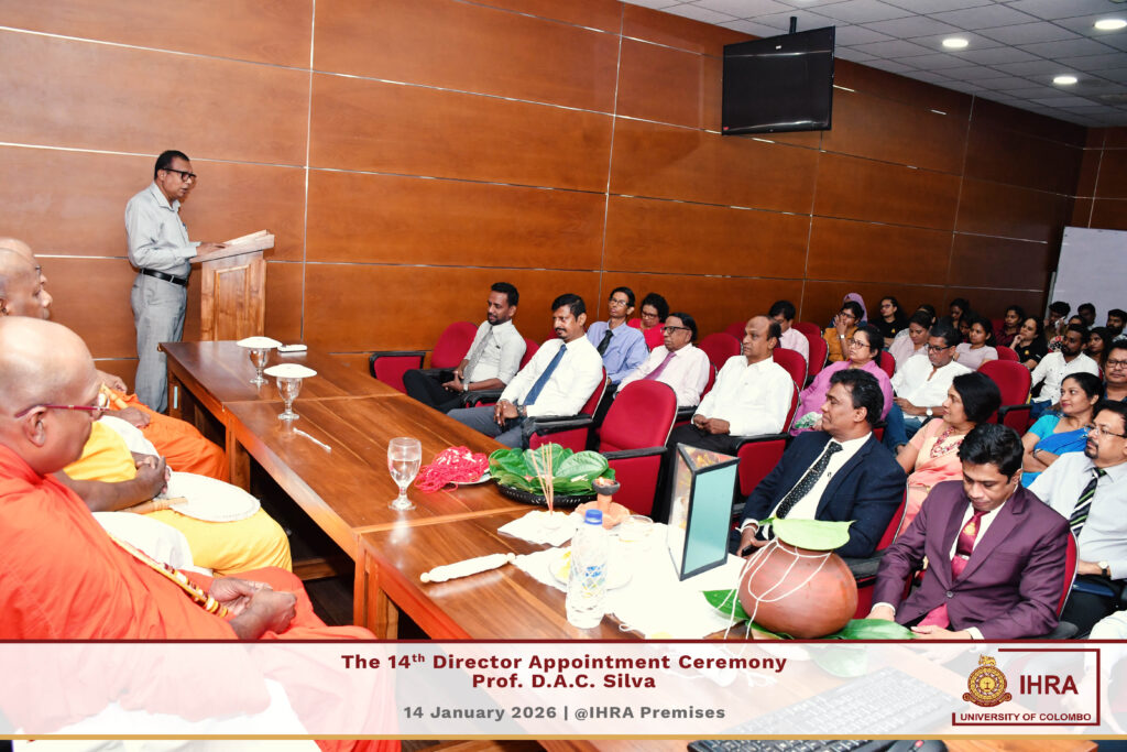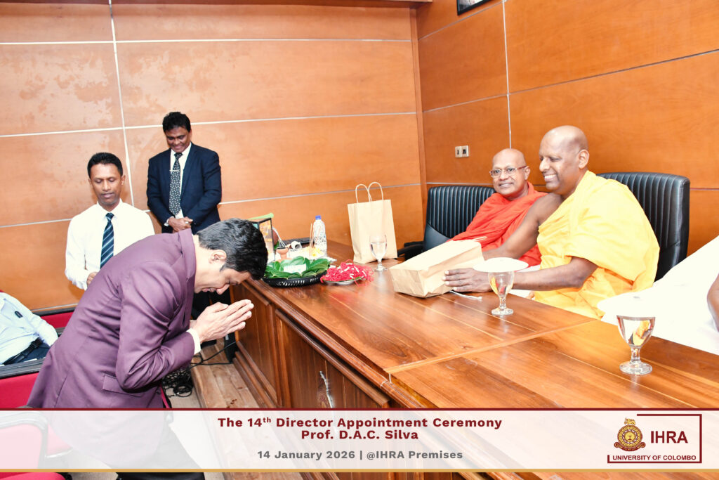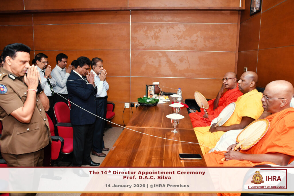 The 14th Director Appointment Ceremony of the Institute of Human Resource Advancement (IHRA), University of Colombo was held at the IHRA premises on 14 January 2026, with the participation of distinguished guests. The ceremony was graced by Kirinde Assaji Thero, Viharadhipathi of the Gangaramaya Temple; Ven. Prof. Agalakada Siri Sumanasara Thero, Professor in Sinhala, Department of Sinhala, Faculty of Arts, University of Colombo; and Rev. Prof. Emeritus W. Wimalaratana, Faculty of Arts, University of Colombo.