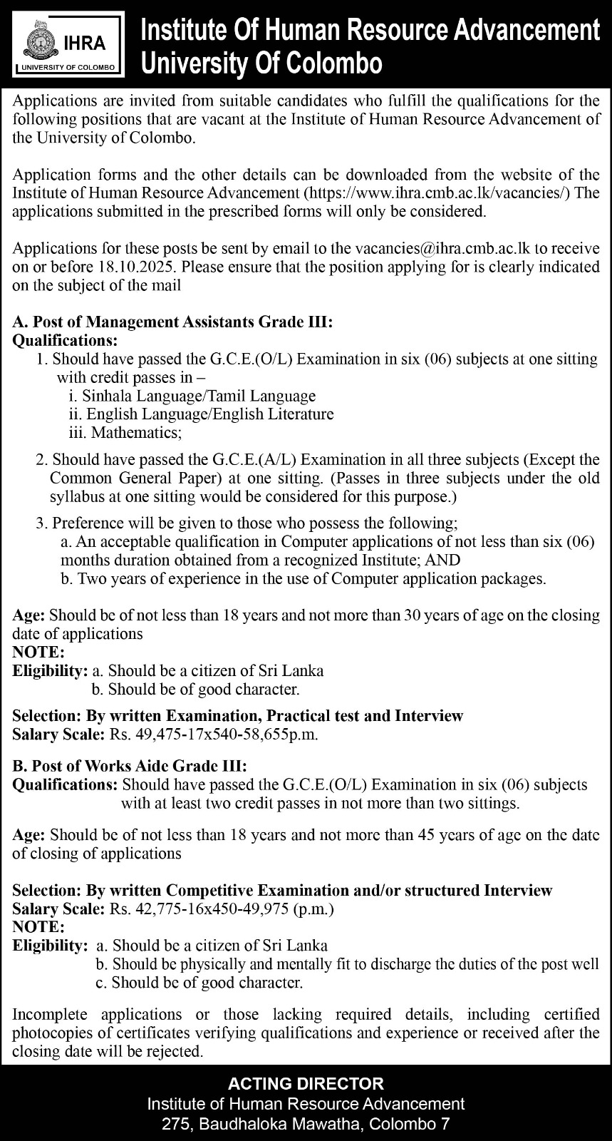 Submit your application together with all required scanned documents to the following email address: 📧 vacancies@ihra.cmb.ac.lk